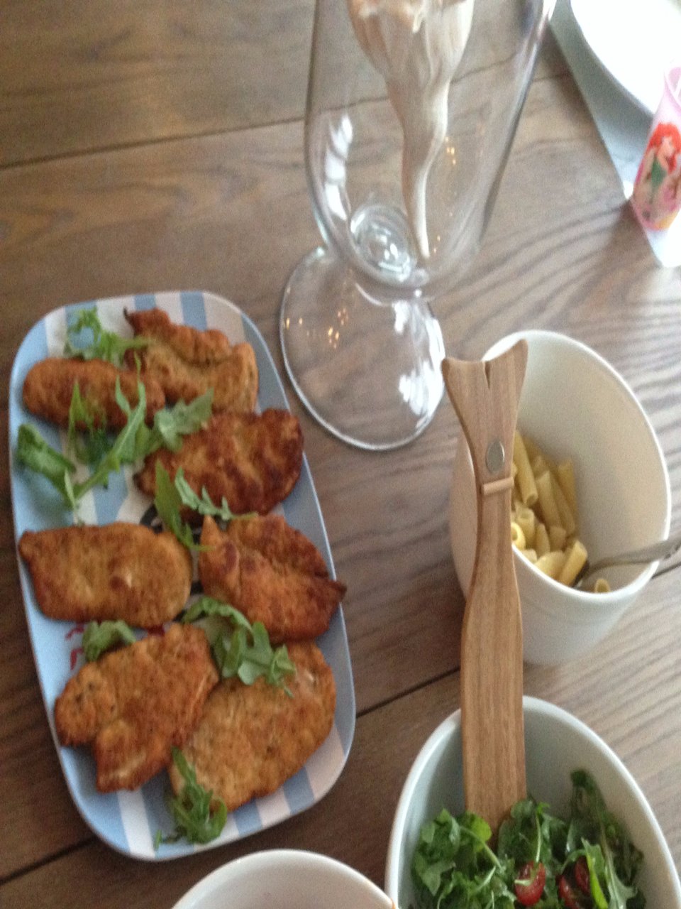 also das Wetter war nicht so berauschend, leider bewölkt und regen, somit konnten wir nicht rausgehen. Dafür habe ich heute den Kids fürs Abendessen Hühnerschnitzl gemacht mit Pasta (Kirschtomaten, Schwammerl, Spinat, Mozzarella) und Salat. Ellen hat sich riesig gefreut als sie mit den Mädls kam (sie waren im Kino), das alles schon vorbereitet war.
